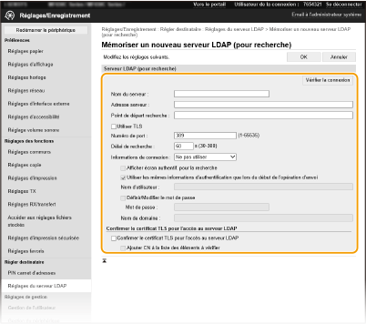 Les serveurs LDAP doivent être enregistrés séparément soit pour la recherche soit pour l'authentification. Pour utiliser un serveur pour la recherche de destinataire de fax et d'e-mails, enregistrez-le pour la recherche, et pour l'utiliser pour l'authentification pour l'envoi d'e-mail ou de fax, enregistrez-le pour l'authentification.