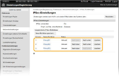 Die Richtlinien werden angefangen mit der ganz oben aufgeführten Richtlinie angewendet. Klicken Sie auf [Nach oben] oder [Nach unten], um eine Richtlinie in der Reihenfolge nach oben oder unten zu verschieben.