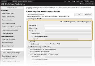 Wenn Sie SMTP-Authentisierung (SMTP AUTH) konfigurieren, erfolgt zum Zeitpunkt des Versands von E-Mail oder I-Fax eine Benutzeridentifizierung über Benutzername und Passwort.
