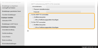 Aktivieren Sie das Kontrollkästchen, wenn Sie die Kommunikation mit dem SMTP-Server mit TLS verschlüsseln möchten. Aktivieren Sie je nach Bedarf das Kontrollkästchen [Zertifikat überprüfen] oder [CN zu Verifizierungspunkten hinzufügen].