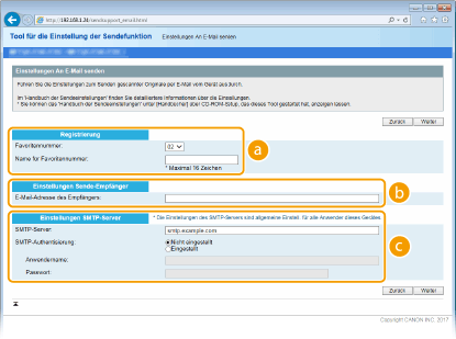Das Tool für die Einstellung der Sendefunktion unterstützt Sie bei der Konfiguration von grundlegenden Einstellungen für das Senden von E-Mails. Anstelle des Tool für die Einstellung der Sendefunktion können Sie Remote UI verwenden, um detailliertere Einstellungen wie beispielsweise Einstellungen für die POP-Authentisierung vor dem Senden oder für die verschlüsselte Kommunikation zu konfigurieren. Konfigurieren von Einstellungen für die E-Mail-/I-Fax-Kommunikation |