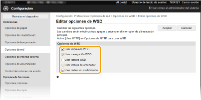 El escaneado WSD le permite escanear documentos en un ordenador sin instalar el controlador del escáner. Marque la casilla de verificación para escanear documentos a través de WSD. Cuando no utilice el escaneado WSD, desmarque la casilla de verificación.