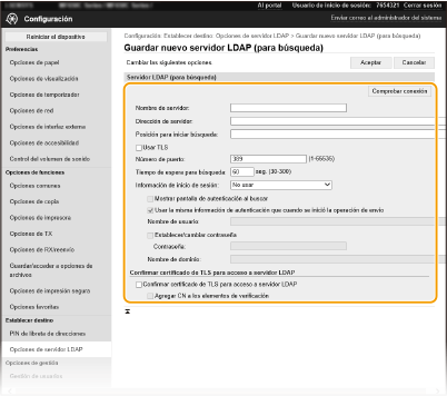Haga clic en [Guardar nuevo servidor] para [Servidor LDAP (para búsqueda)] o [Servidor LDAP (para autenticación)].