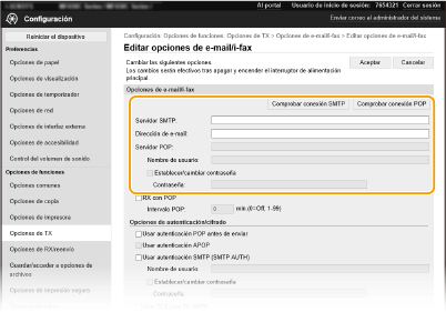 Utilice la IU remota para configurar las opciones detalladas de envío y recepción, como pueden ser las opciones para utilizar el equipo para enviar y recibir I-Faxes y las opciones para la autenticación POP y el cifrado de la comunicación antes de enviar e-mails o I-Faxes. Póngase en contacto con su proveedor o administrador de red para obtener la configuración necesaria.