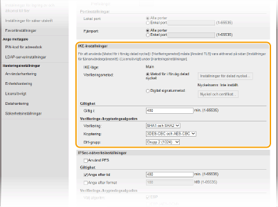 Markera kryssrutan för att aktivera PFS (Perfect Forward Secrecy) för IPSec-sessionsnycklar. Om du aktiverar PFS utökas säkerheten och samtidigt ökar kommunikationsbelastningen. Kontrollera att PFS också aktiverats för de andra enheterna.