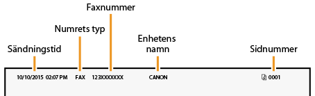 Registrera enhetens faxnummer och enhetsnamn. Informationen skrivs ut överst på varje sida som du sänder från enheten.