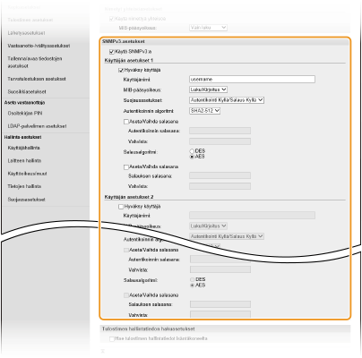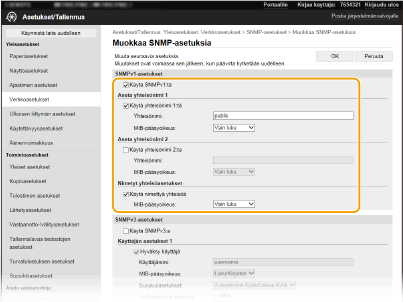 SNMP (Simple Network Management Protocol) on protokolla, jolla valvotaan ja ohjataan verkon tiedonsiirtolaitteita käyttämällä MIB:tä (Management Information Base). Laite tukee SNMPv1-protokollaa ja edistyneemmän suojauksen SNMPv3-protokollaa. Voit tarkistaa laitteen tilan tietokoneesta, kun tulostat asiakirjoja tai käytät Etäkäyttöliittymää. Voit ottaa käyttöön SNMPv1:n, SNMPv3:n tai molemmat samanaikaisesti. Määritä kunkin version asetukset verkkoympäristöön ja käyttötarkoitukseen sopiviksi.