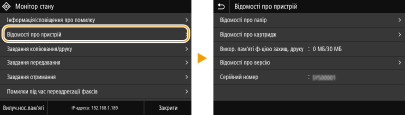 Можна змінювати багато параметрів, пов’язаних із дисплеєм, наприклад мову відображення вмісту: <Параметри відображення> Для змінення екрана, який автоматично відображається, коли апарат не використовується протягом певного визначеного проміжку часу: <Функція після автоматичного скидання> Можна змінити різні параметри функціональності, наприклад яскравість екрана: <Спеціальні можливості> |