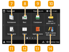 ![]() | <Копіювання>Натисніть цю кнопку, щоб почати копіювання. Копіювання <Факс>Натисніть цю кнопку, щоб надіслати факс з апарата. Факс <Сканування>Сканує оригінал і перетворює його на електронний файл. Відскановані файли можна зберігати на комп’ютері або надсилати електронною поштою. Сканування <Друк із носія пам’яті>Друкує файли, які зберігаються на пристрої USB-пам’яті. Друк із пристрою USB-пам’яті (друк із носія пам’яті) <Захищ. друк>Використовуйте цю функцію, щоб надрукувати захищений документ. Друк документа, захищеного PIN-кодом (безпечний друк) <Меню>Спочатку потрібно натиснути цю кнопку, щоб перейти до параметрів <Параметри функції>, <Настройки> тощо. Список меню параметрів <Адр. книга>Використовуйте для реєстрації або редагування адресатів електронної пошти та факсів. Також можна відобразити інформацію про зареєстрованого адресата під час надсилання електронного листа або факсу. Реєстрація адресатів <Посіб.із викор. бібл.програм>Відображає опис програми Application Library (Бібліотека прикладних програм). |