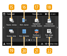 ![]() | <Парам. паперу>За допомогою цієї кнопки можна вказати формат і тип паперу, який завантажується до шухляди для паперу та багатофункціонального лотка. Встановлення формату та типу паперу <Моб. портал>Використовуйте цей елемент, щоб установити підключення до мобільного пристрою. Встановлення зв’язку з мобільними пристроями <Параметри головн. екрана>Дає змогу змінити порядок розташування кнопок на екрані Головний Налаштування екрана Головний <Оновлення мікропрограми>Дає змогу оновити мікропрограми через Інтернет. Оновлення мікропрограми <Копіюв. посв.>Використовуйте цю функцію для копіювання, під час якого лицева та зворотна сторони водійських прав або інших посвідчень будуть надруковані на одній сторінці. Копіювання посвідчення <Коп. паспорта>Для копіювання кількох сторінок паспорта на одному аркуші. Копіювання паспорта <Посібник з експлуатації>Натисніть цю клавішу, щоб переглянути інструкції щодо використання апарата або пояснення можливих причин помилок і шляхів їх усунення. <Пар. бездр. лок. мер.>Налаштуйте параметри безпровідної локальної мережі за допомогою цієї кнопки. Підключення до бездротової локальної мережі |