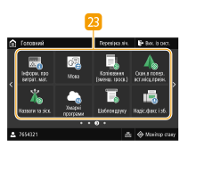 на панелі керування. Цей екран призначено для вибору параметрів і реєстрації функцій.![]() | Змінення сторінкиВикористовуйте цю кнопку для перегляду іншої сторінки на екрані Головний. Для переходу до наступної сторінки можна також гортати по дисплею вбік. <Перевірка ліч.>Відобразиться загальний обсяг роздруківок. Перегляд значення лічильника <Вих. із сист.>Натисніть цю кнопку, щоб вийти із системи апарата. <Монітор стану>Натисніть цю клавішу, щоб перевірити стан друку, переглянути журнал використання апарата й параметри мережі, зокрема IP-адресу апарата. Можна також перевірити стан апарата, наприклад, залишок паперу й тонера в картриджі, або наявність помилок. Екран <Status Monitor> Піктограма проводової та безпровідної локальної мережіПіктограма проводової локальної мережі відображається під час підключення до проводової локальної мережі, а піктограма безпровідної локальної мережі – під час підключення до безпровідної локальної мережі. Натисніть цю піктограму, щоб налаштувати параметри проводової або безпровідної локальної мережі. <Мережа> Ім’я користувача/IDВідображається ім’я чи ID користувача в системі. |