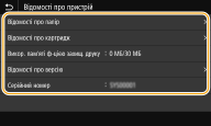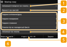 Якщо натиснути <Монітор стану>, з’явиться екран, на якому можна перевірити стан документів і апарата й інформацію про параметри мережі.