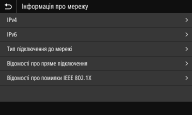 Відображає налаштування мережі та її стан, наприклад дані про IP-адресу апарата та стан підключення до бездротової локальної мережі.
