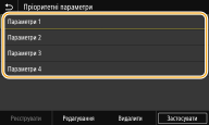 Для швидкого виклику однакових параметрів для функцій копіювання, факсу та сканування їх можна зареєструвати як пріоритетні. Зареєстровані комбінації параметрів можна додати на екран Головний як кнопки швидкого доступу. Реєстрація часто використовуваних параметрів