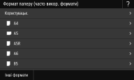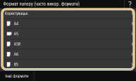 Якщо наведений вище екран не відображається після завантаження паперуЯкщо в багатоцільовий лоток потрібно постійно завантажувати папір одного формату, можна пропустити операції з налаштування параметрів паперу, зареєструвавши формат і тип паперу як параметр за промовчанням. Коли зареєстровано параметри за промовчанням, наведений вище екран не відображається. Щоб відображати екран, виберіть <Указати під час завантаження паперу> (Реєстрація параметрів паперу за промовчанням для багатоцільового лотка). |