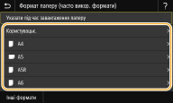 Після реєстрації параметрів паперу за промовчанням екран параметрів паперу не відображається під час завантаження паперу й завжди використовуються ті самі параметри. Якщо завантажити папір іншого формату або типу, не змінивши параметри паперу, це може призвести до неправильного друку. Щоб уникнути виникнення цієї проблеми, виберіть <Указати під час завантаження паперу> під час виконання кроку 3, а потім завантажте папір. |