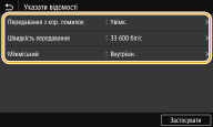 Можна також указати параметри <Передавання з кор. помилок> і <Швидкість передавання> в розділі <Меню> <Параметри функції> <Надсилання> <Параметри факсу>. Проте параметри, вибрані в розділі <Адр. книга>, доступні для розширених параметрів адресатів, зареєстрованих в адресній книзі. |