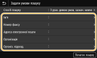 7 | Натисніть <Початок пошуку>. Відображаються користувачі, які відповідають критеріям пошуку. ![]() Якщо під час натискання кнопки <Початок пошуку> з’являється екран автентифікації, введіть ім’я користувача апарата й пароль, зареєстрований на LDAP-сервері, а потім виберіть <Застосувати>. Реєстрація серверів LDAP |