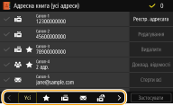 ![]() | Адресатів, які часто використовуються під час сканування та надсилання факсів, можна зареєструвати в адресній книзі, щоб за потреби швидко їх знаходити (Реєстрація адресатів в адресній книзі). Адресатів можна шукати в алфавітному порядку, у списках адресної книги або введенням тризначних чисел (кодів кодованого набору). Указувати адресатів можна ще швидше, використовуючи наведені нижче функції. |