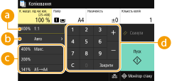 <Тип ориг./кін.обр.>![]() | Копії можна збільшувати або зменшувати за допомогою попередньо встановленого коефіцієнта масштабування, наприклад <A5->A4>, або встановивши користувацький коефіцієнт масштабування з кроком 1%. |