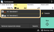 Щоб дізнатися, як виконувати копіювання з використанням одних і тих самих параметрів, див. розділ Змінення параметрів за промовчанням для функцій Щоб дізнатися, як зареєструвати комбінацію параметрів, щоб за потреби використовувати їх, див. розділ Реєстрація часто використовуваних параметрів |