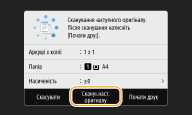 1 | Помістіть наступний оригінал на скло експонування та виберіть елемент <Сканув.наст. оригіналу>. Для кожного оригіналу можна також окремо вказати значення <Насиченість> і <Тип оригіналу>. ![]() Повторюйте цей крок, доки весь оригінал не буде відскановано. |