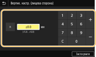 Під час настроювання позиції друку вкажіть напрямок за допомогою знака «+» чи «–» і відстань у «міліметрах». Для параметрів <Верт. настр. (лицева сторона)>/<Вертик. настр. (звор. сторона)> укажіть значення за допомогою знака «+», щоб змістити позицію в напрямку вгору-вниз. Для параметрів <Гориз. настр. (лиц. сторона)>/<Гориз. настр. (звор. сторона)> укажіть значення за допомогою знака «+», щоб змістити позицію в напрямку вліво-вправо. Щоб змістити в протилежному напрямку, укажіть значення за допомогою знака «–».