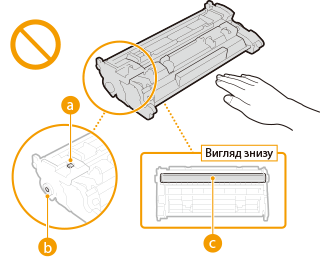 Обов’язково тримайте тонер-картридж за рукоятку. Не торкайтеся чипа пам’яті картриджа з тонером (  ) чи електричних контактів (  ). Щоб запобігти виникненню подряпин на поверхні барабана всередині апарата або потраплянню світла, не відкривайте захисну шторку барабана (  ). |