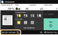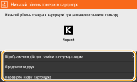 Це повідомлення інформує про те, що скоро буде необхідно замінити картридж із тонером. Переконайтеся, що запасний картридж із тонером напоготові. Якщо це повідомлення відображається перед початком друку великого завдання, замініть картридж із тонером. Цей елемент відображається, якщо для параметра <Дія під час попередження> встановлено значення <Зупинити друк> (