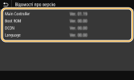 Перевірка версії мікропрограмиПеревірити версію мікропрограми можна на панелі керування апарата. Після завершення операції оновлення мікропрограми переконайтесь, що оновлення виконано правильно. Перевірка версії мікропрограми |
