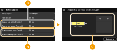 Зсуньте положення для друку, щоб скоригувати поле для скріплення, яке застосовуватиметься до краю для скріплення, зазначеного в параметрі <Місце оправи>. Значення «00,0» не впливає на поле для скріплення.