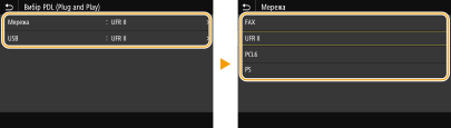 Виберіть мову опису сторінки, щоб під час підключення апарата до комп’ютера за допомогою технології Plug and Play комп’ютер виявляв апарат як принтер, сумісний із цією мовою.