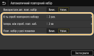 Указує, скільки разів апарат здійснює повторний набір. Введіть номер і виберіть елемент <Застосувати>.