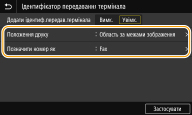 <Додати ідентиф.передав.термінала> <Вимк.> <Увімк.>  <Положення друку> <Внутрішня область зображення> <Область за межами зображення>  <Позначити номер як> <Fax>  <Tel> |