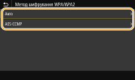 2 | Виберіть спосіб шифрування. ![]() <Авто> Апарат автоматично вибиратиме AES-CCMP або TKIP відповідно до параметрів маршрутизатора бездротової локальної мережі. <AES-CCMP> Встановлює AES-CCMP як метод шифрування. |