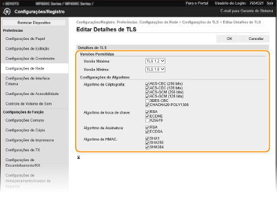 Utilizar o painel de controloTambém pode ativar ou desativar a comunicação TLS codificada a partir de <Menu> no ecrã Início. <Interface Remota>