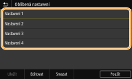Aby bylo možné rychle vyvolat stejné nastavení pro kopírování, faxování a skenování, můžete je uložit jako oblíbené nastavení. Kombinace uložených nastavení můžete přidat na obrazovku Domů formou tlačítek zástupců. Uložení často používaných nastavení