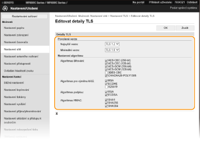 Použití ovládacího paneluPomocí možnosti <Nabídka> na obrazovce Domů také můžete povolit nebo zakázat komunikaci šifrovanou pomocí protokolu TLS. <Vzdálené UR>