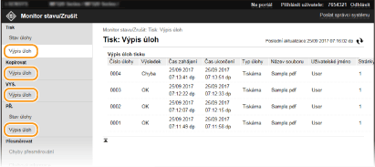 V seznamu budou uvedeny všechny právě tištěné dokumenty i dokumenty čekající na tisk, a to bez ohledu na nastavení správy ID oddělení.
