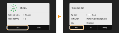 Chcete-li zrušit odesílání dokumentů bezprostředně po výběru možnosti <Spustit>, vyberte možnost <Zrušit> na displeji nebo stiskněte tlačítko . Odesílání dokumentů lze také zrušit po kontrole stavu odesílání.