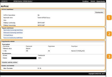 Az AirPrint-tel elérhető lapolvasási funkció be-/kikapcsolható. Az alapértelmezett gyári beállítás a <Be>.