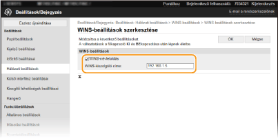 Ha törli a jelet a [NetBIOS használata] jelölőnégyzetből a [Számítógépnév/Munkacsoportnév beállításai] pontnál, akkor a WINS beállítás inaktívvá válik. Győződjön meg róla, hogy a [NetBIOS használata] jelölőnégyzet be legyen jelölve a WINS használata esetén.