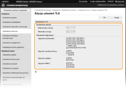 Korzystanie z panelu sterowaniaKomunikację szyfrowaną z użyciem protokołu TLS można również włączyć albo wyłączyć z poziomu <Menu> na ekranie Główny. <Zdalny interfejs użytkownika>