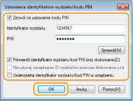 [Zezwalaj na zadania drukowania o nieznanym identyfikatorze]Aby wysyłać zadania z komputera przy włączonej funkcji Zarządzanie identyfikatorami wydziałów, należy wprowadzić odpowiedni identyfikator oraz kod PIN (