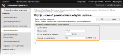 Zaznaczenie tego pola wyboru umożliwia powiadamianie oprogramowania do zarządzania urządzeniami o stanie zasilania urządzenia. Zaznaczenie opcji [Powiadom] pozwala na uniknięcie nawiązywania przez urządzenie zbędnej komunikacji w trybie uśpienia i zmniejszenie całkowitego zużycia energii. [Numer portu]