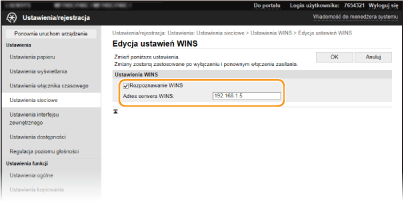 Jeśli odznaczysz pole wyboru [Użyj NetBIOS] w [Ustawienia nazwy komputera/nazwy grupy roboczej], ustawienie WINS zostanie wyłączone. Upewnij się, że zaznaczono pole wyboru [Użyj NetBIOS] podczas korzystania z serwera WINS.