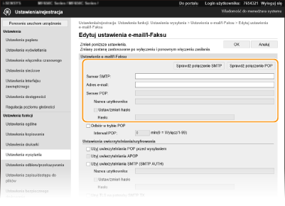 Za pomocą Zdalnego interfejsu użytkownika można przed wysłaniem wiadomości e-mail lub I-faksu skonfigurować szczegółowe ustawienia wysyłania i odbierania, w tym ustawienia urządzenia do wysyłania i odbierania I-faksów, ustawienia uwierzytelniania POP oraz ustawienia szyfrowania komunikacji. Wymagane ustawienia należy uzyskać od dostawcy usług lub administratora sieci.