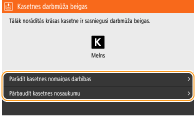 Ja, iekārtai saņemot faksa/I-Fax dokumentu vai iestatot automātisku pārskatu izvadi, tiek parādīts ziņojums, saņemtie faksa/I-Fax dokumenti un pārskati tiks saglabāti atmiņā, lai pēc izdrukāšanas tie nebūtu blāvi. Lai turpinātu drukāšanu, pat ja tonera kasetnē atlicis maz tonera, iestatiet opciju <Turp. dr., ja daudz.kas. zems> pozīcijā <Ieslēgt>. <Turp. dr., ja daudz.kas. zems>