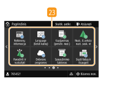 Paspauskite, jei norite patikrinti spausdinimo būseną, peržiūrėti naudojimo istoriją arba aparato tinklo parametrus, pvz., IP adresą. Taip pat galima patikrinti aparato būseną, pavyzdžiui, popieriaus likutį arba dažomųjų miltelių lygį kasetėse, arba peržiūrėti, ar neįvyko klaidų. Ekranas <Būsenos ekranas>