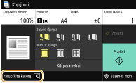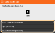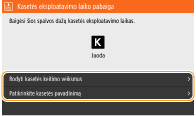 Jei aparatui priimant faksogramą / internetinę faksogramą arba esant nustatytai automatinei ataskaitų išvesčiai rodomas pranešimas, gautos faksogramos / internetinės faksogramos ir ataskaitos bus išsaugomos atmintyje, kad išspausdinus neatrodytų išblukusios. Jei norite toliau spausdinti, net jei liko mažas kiekis dažomųjų miltelių, <Tęsti spausd. kai maž. rašalo> nustatykite kaip <Įjungta>. <Tęsti spausd. kai maž. rašalo>